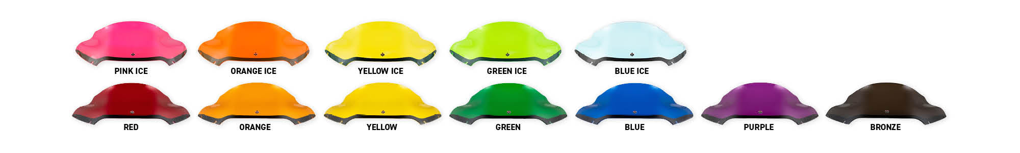 - Kolor Flares®: Made from premium acrylic and offered in a vibrant array of colors—Red, Orange, Yellow, Green, Blue, Purple, and Bronze—these windshields for Road Glide deliver a bold, distinctive style that sets your motorcycle apart.